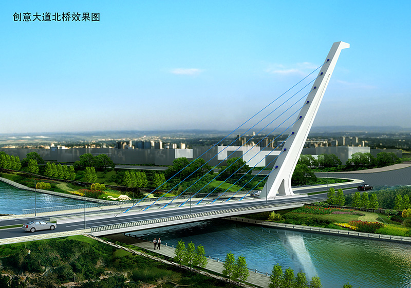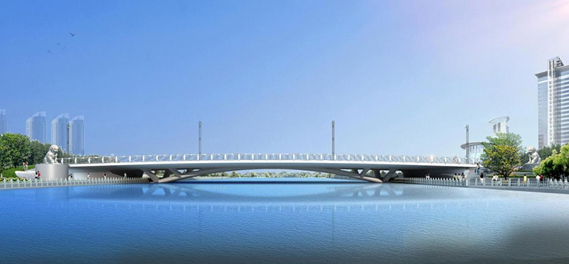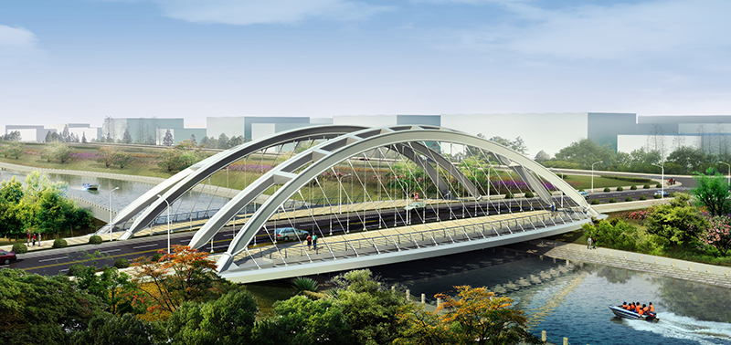 匯智橋路南、北橋均為無背索獨塔單索面斜拉橋,橋跨 82 米,全寬 33.5 米;智力島路橋為單跨新型斜靠式拱肋下承式梁拱組合體系橋,橋跨 70 米,寬度 33.5-42.9 米;聚賢橋路南橋為上承式梁拱組合橋,橋跨組合為16.5+59+16.5=92 米,寬度 30 米;聚賢橋路北橋為斜腿剛構(gòu)橋,橋跨組合為 21+28+21=70 米,寬度 30 米。